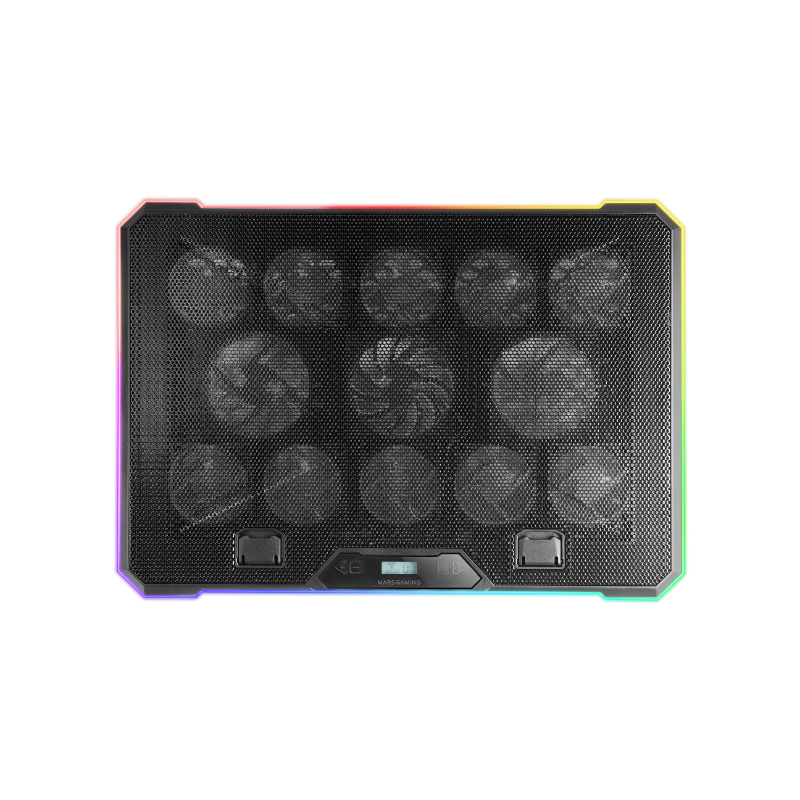 Descubre la MNBC13, la base de refrigeración definitiva para portátiles de hasta 17 pulgadas, diseñada para maximizar tu productividad y experiencia de juego. Con 13 ventiladores ultrasilenciosos y un sistema de iluminación RGB personalizable, ofrece una refrigeración avanzada y un estilo único. Su diseño ergonómico con función stand, pantalla LCD, y soporte para smartphone, junto con dos puertos USB, la convierten en una herramienta esencial para tu escritorio.